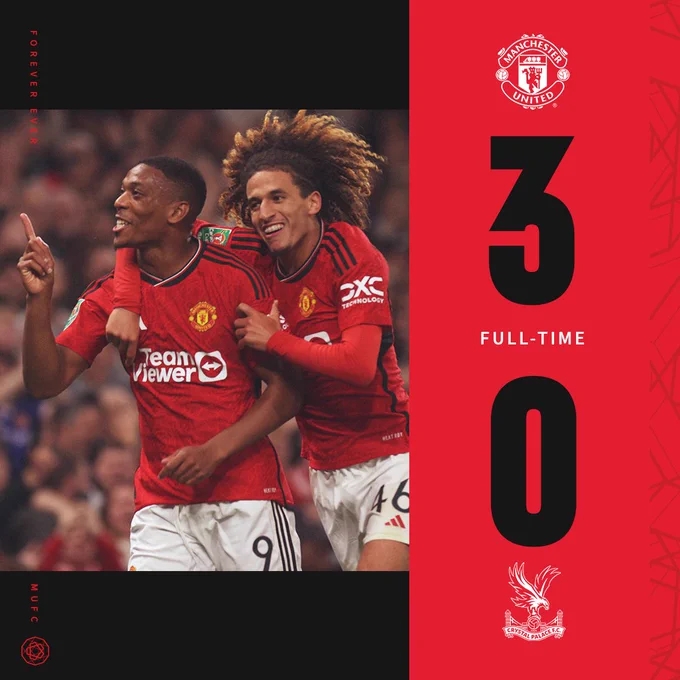 联赛杯-曼联3-0水晶宫晋级 卡塞米罗传射加纳乔马夏尔破门